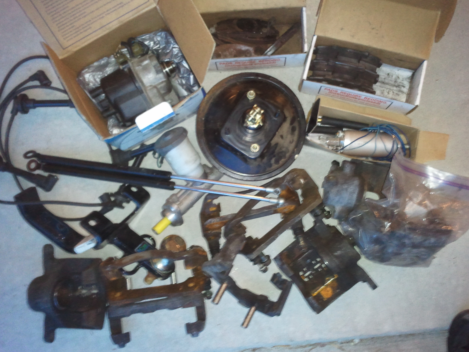 dug this up while cleaning out my garage. four or five brake calipers and brackets, maybe good for a big brake conversion. two boxes of brake pads, one says type R and i think they're carbotech xp8. tow hitch for a da integra. plug wires, fuel pump, distributor, hatch struts, master cylinder, and booster, all type unknown. best offer takes it all. they're already packed up in a bin and i know nothing more than what i've written here. email jtower at gmail if interested.